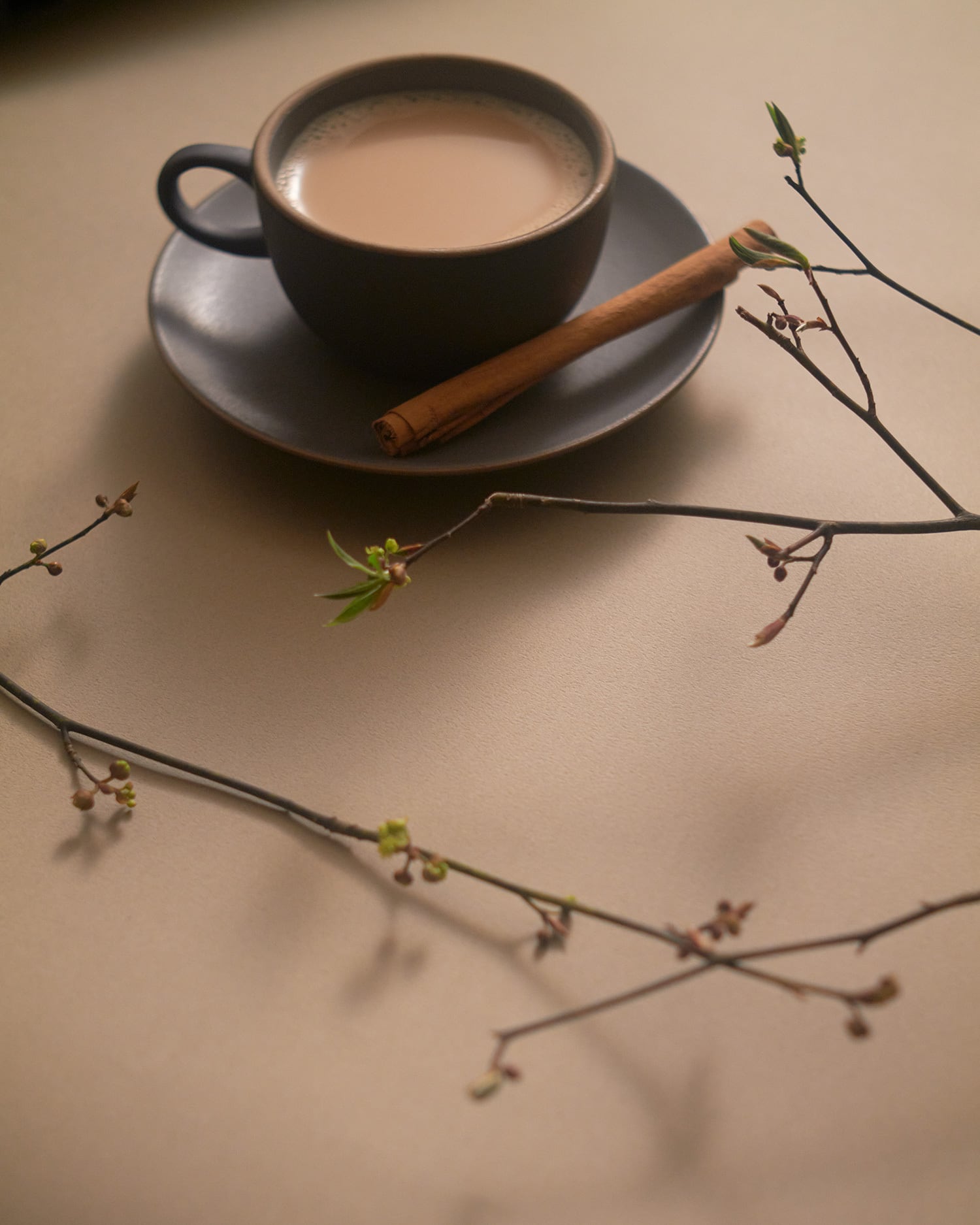 Chai Apothecaryのオリジナルブレンドは、出雲地方の黒文字、蜂蜜、在来種の出西生姜と、シナモン、カルダモン、クローブ、スターアニスをブレンド。黒文字を基調としたやさしく繊細な味わいで、スパイスや生姜が身体をあたため、心和らぐひとときに。