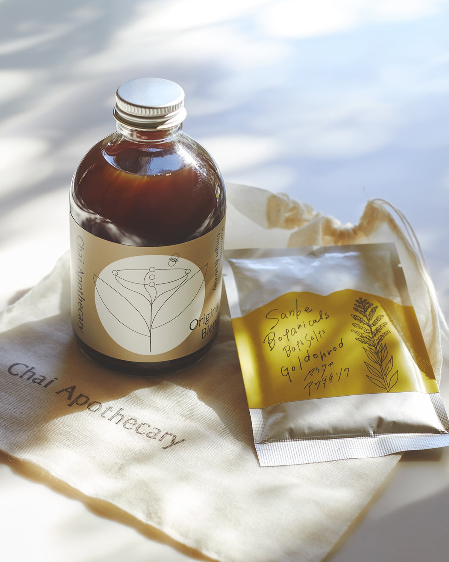 オリジナルブレンドのチャイシロップと、島根県大田市にある三瓶山から届く、セイタカアワダチソウのバスソルトのギフトセットです。冬の養生に、大切な方へ、そしてご自身にも。